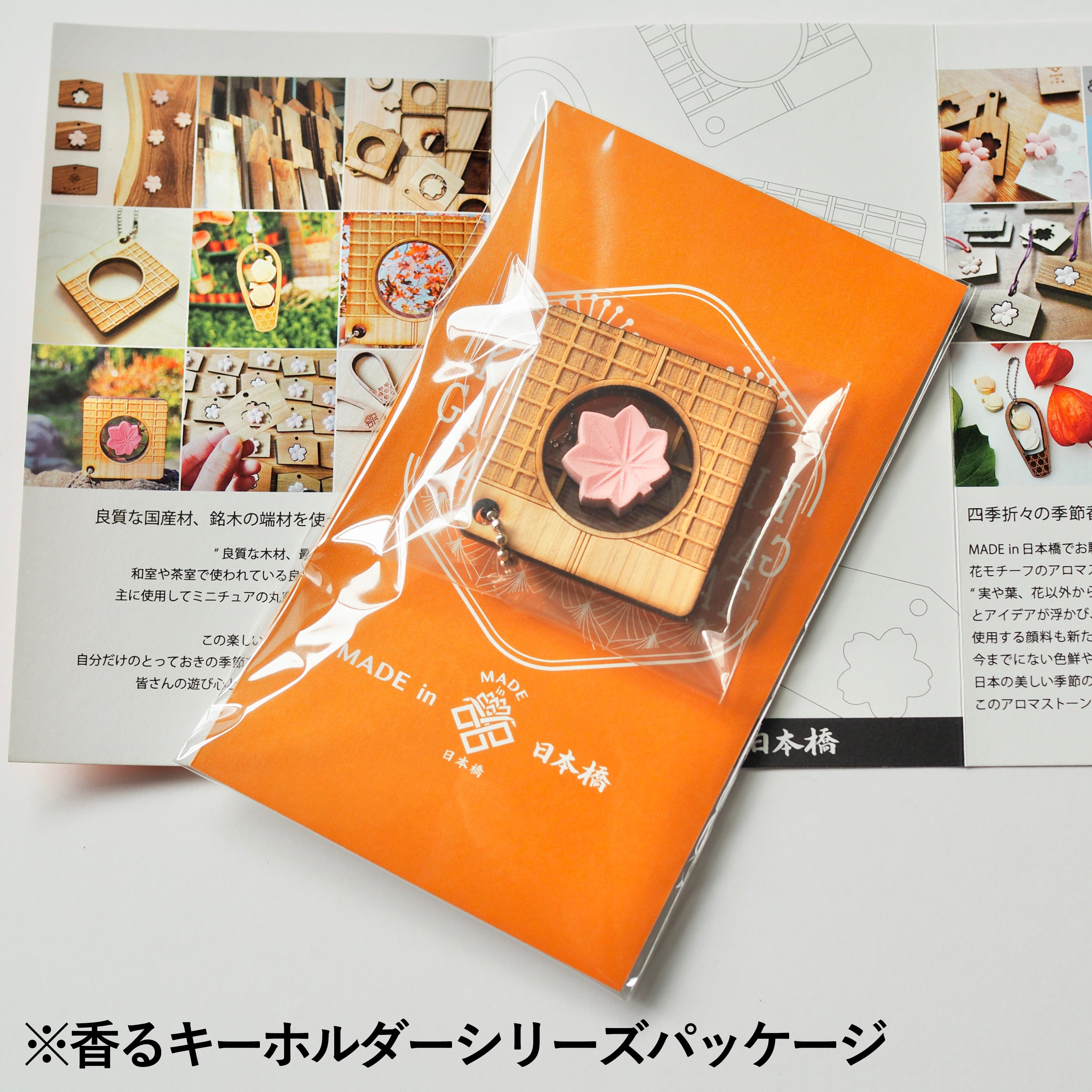 季節をモチーフとしたオリジナルデザインの木枠にアロマストーンのついたキーホルダーです。